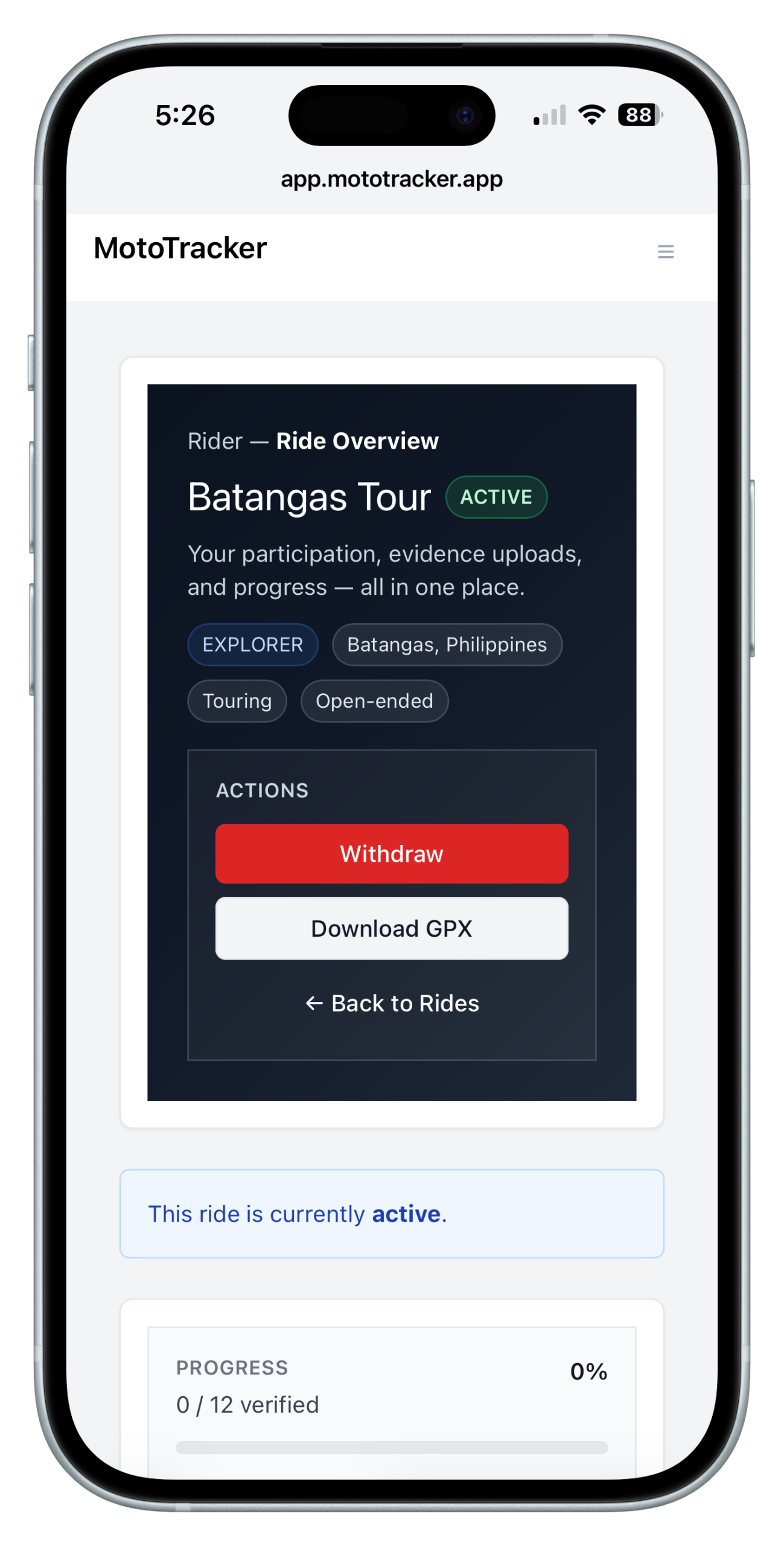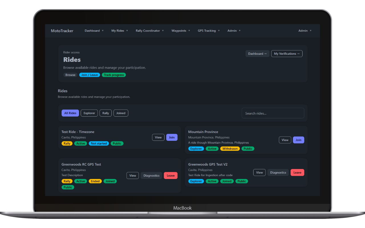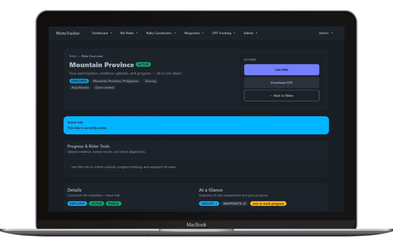 MotoTracker is a GPS-powered platform built for motorcycle rides, endurance challenges, and rally-style events where waypoint credits matter and verification must be reliable.