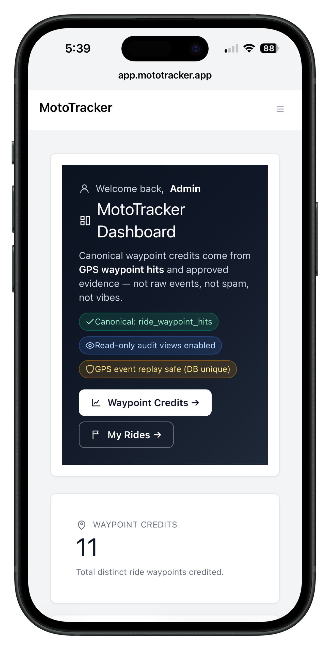 Designed for real-world riding conditions — not theoretical tracking — MotoTracker ensures that every credit earned is backed by verifiable data.
